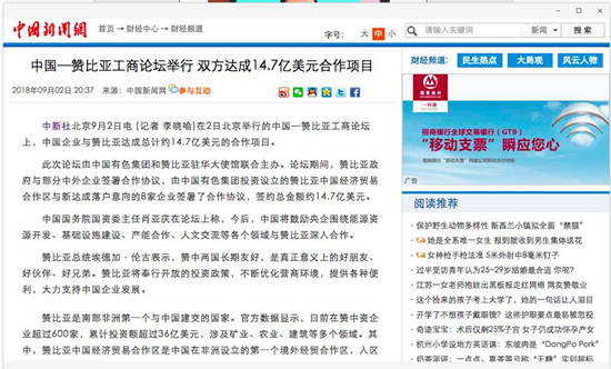 2018年9月2日,由中國有色集團、贊比亞駐中國大使館聯合主辦的“中國-贊比亞工商論壇”在中國有色集團總部舉行。中非合作論壇成立18年來,中贊經貿合作得到了長足發展。中國有色集團在贊比亞的投資合作也邁上了新高度,總投資近30億美元,擁有14家各級企業,一批重點企業和項目脫穎而出。